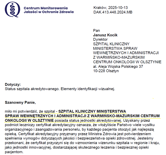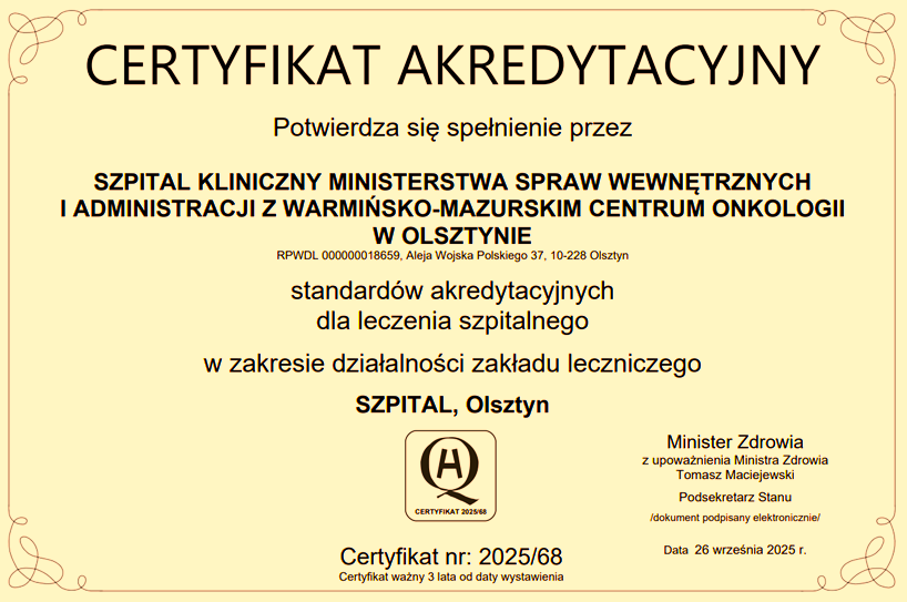 SZPITALOWI KLINICZNEMU MINISTERSTWA SPRAW WEWNĘTRZNYCH i ADMINISTRACJI z WARMIŃSKO-MAZURSKIM CENTRUM ONKOLOGII w OLSZTYNIE akredytacji w zakresie działalności zakładu leczniczego.
