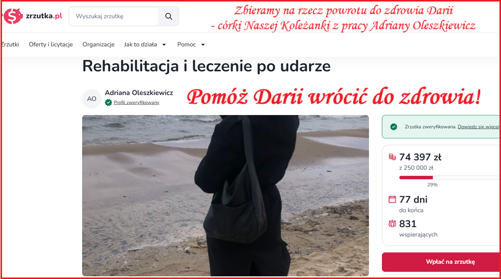 Trwa zbiórka na rzecz Darii – córki Naszej Koleżanki z pracy Adriany Oleszkiewicz.