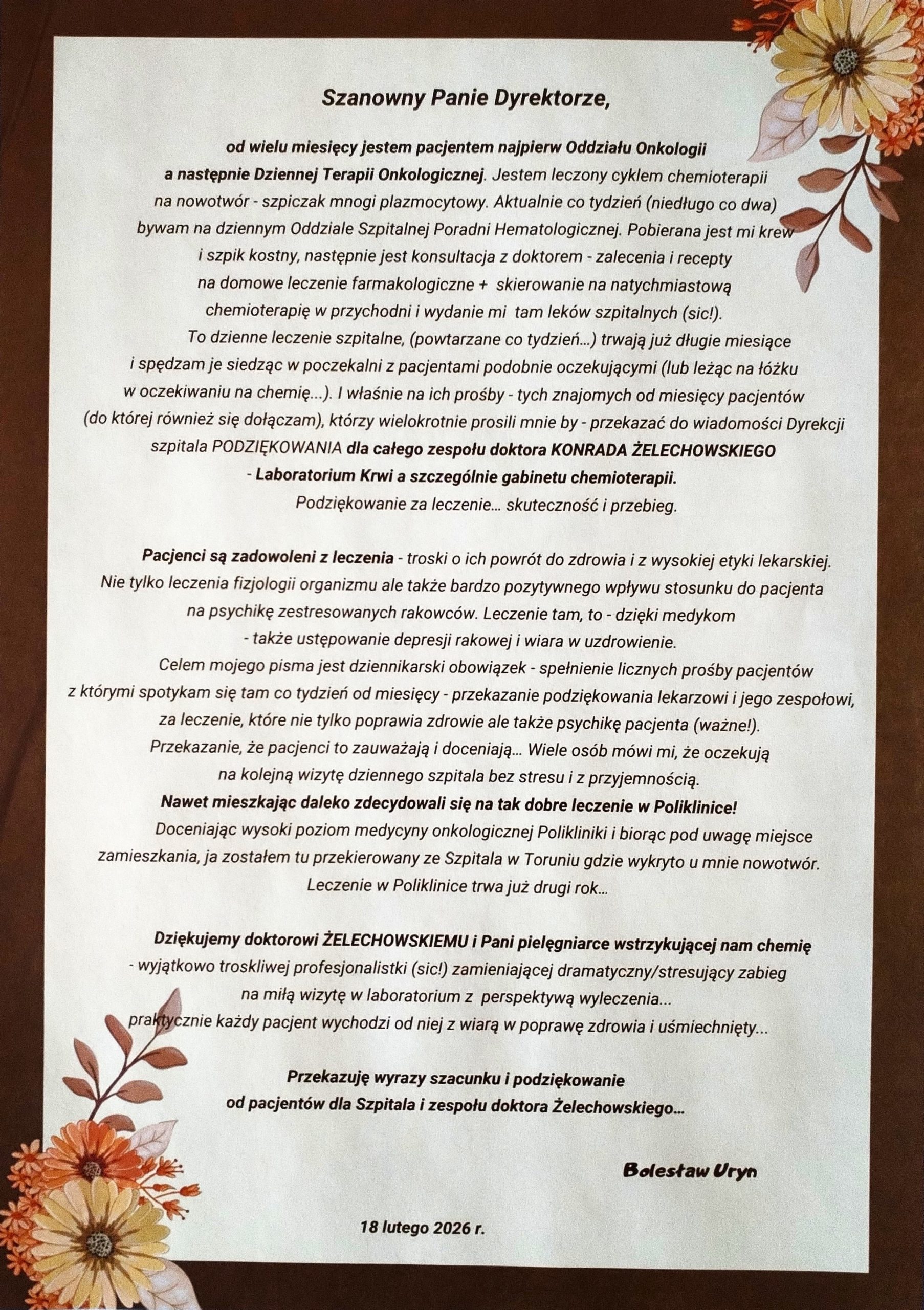 W imieniu całej kadry szpitala dziękujemy personelowi kierowanej przez dra Tomasza Lewandowskiego Kliniki Onkologii i Immunoonkologii z Oddziałem Dziennym Terapii Onkologicznej, który swoją codzienną niełatwą pracą przyczynia się do tak pozytywnego odbioru naszej placówki przez wdzięcznych pacjentów.